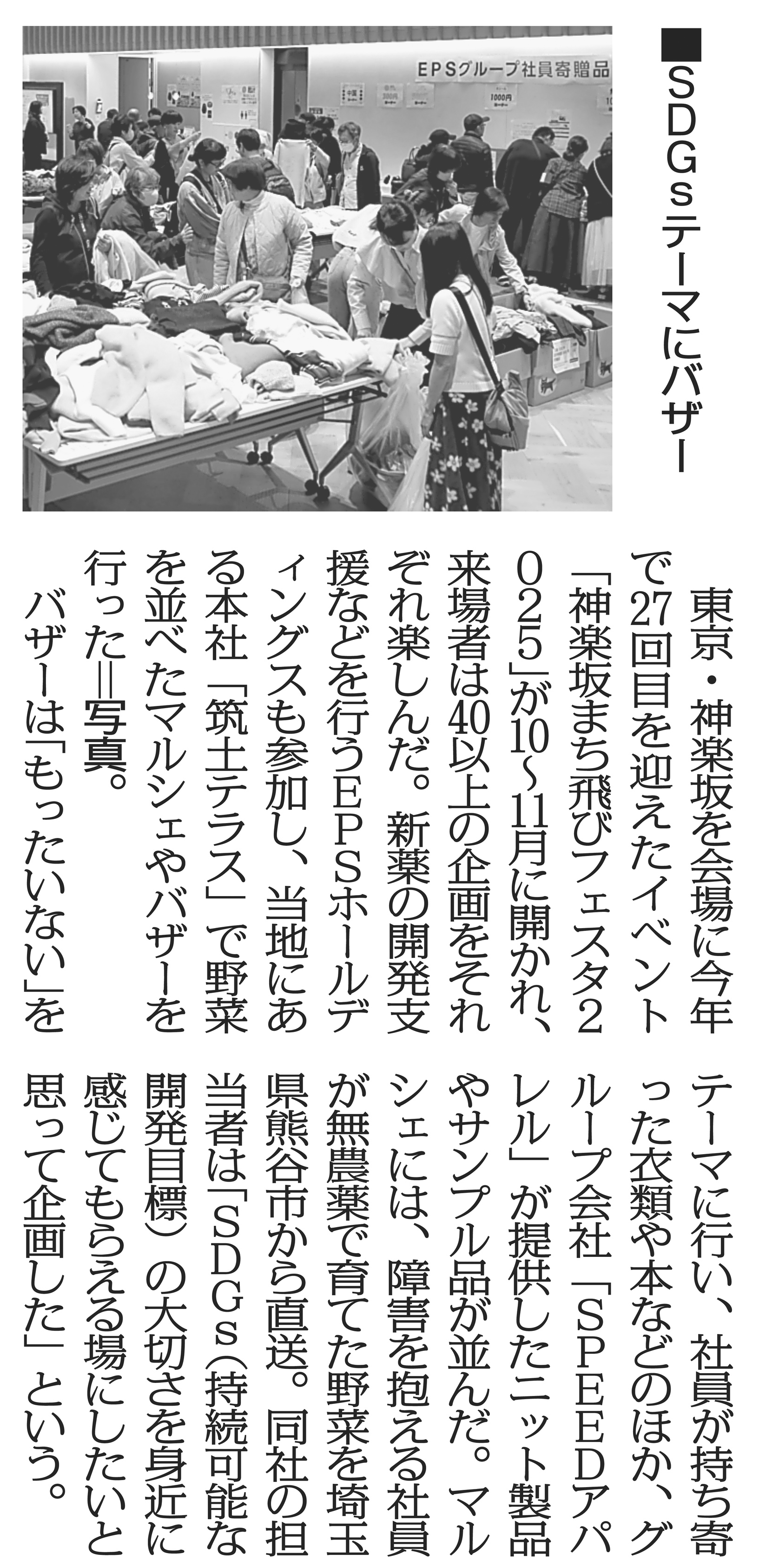 EPSグループは、2025年12月8日(月)付の毎日新聞朝刊「けいざいフラッシュ」に、「SDGsテーマにバザー 神楽坂まち飛びフェスタ」をタイトルとする記事として、当社主催の「チャリティーバザー」の様子が掲載されました。